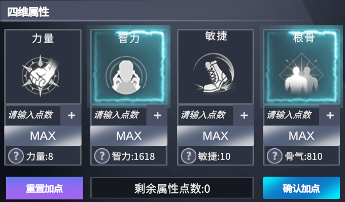 - 重置加点:可使用重置药剂道具重置已配分的属性点