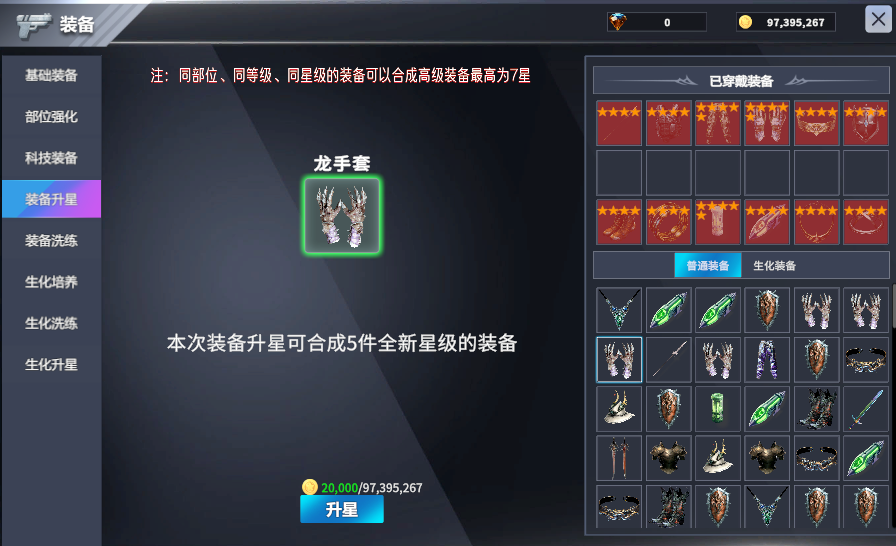 - 3:生化装备可用任意同星级的装备进行升星。