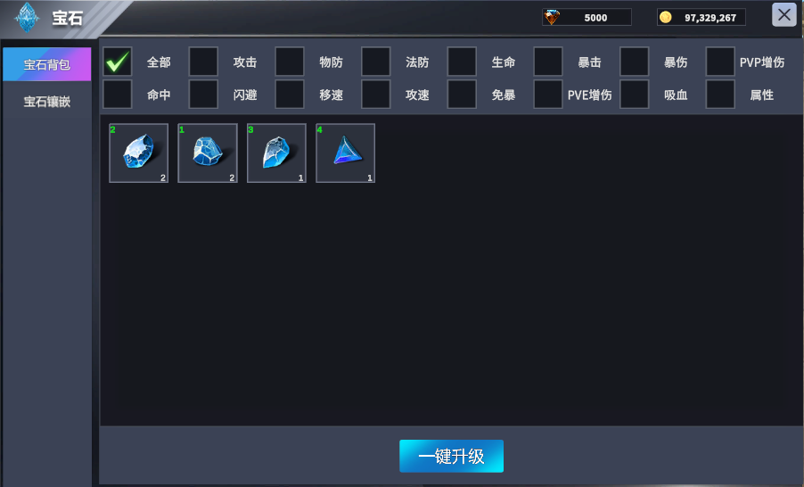 2:宝石背包可查看已拥有宝石明细,一键升级可以自动升级背包内可升级的宝石。