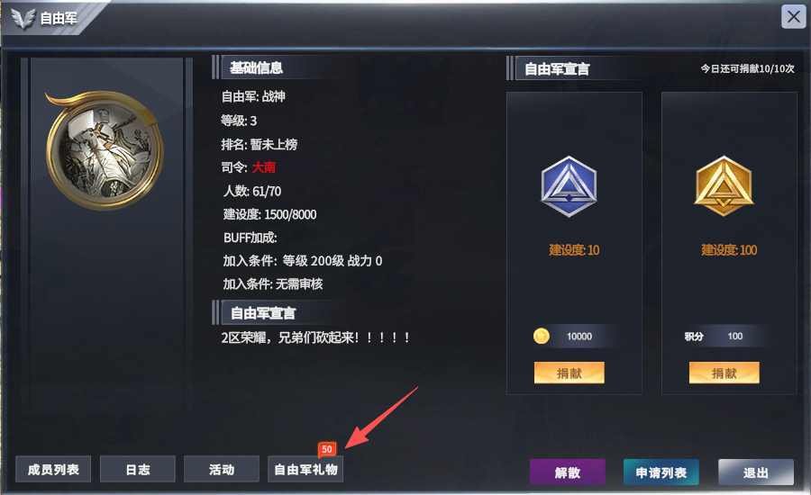 - 1.在军团界面点击“自由军礼物”按钮,即可进入礼物宝箱开启界面。
