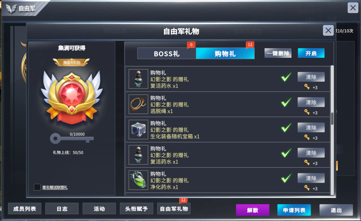 - 2. 已加入军团的玩家可通过击败 BOSS 或消耗积分的方式,向军团内全体玩家发放礼包。